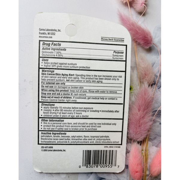Ingredients: beeswax, camphor, cetyl esters, euphorbia cerifera, wax, flavor, lanolin, meadowfoam seed oil, menthol, ozokerite, paraffin, petrolatum, phenol, salicylic acid, cacao seed butter.