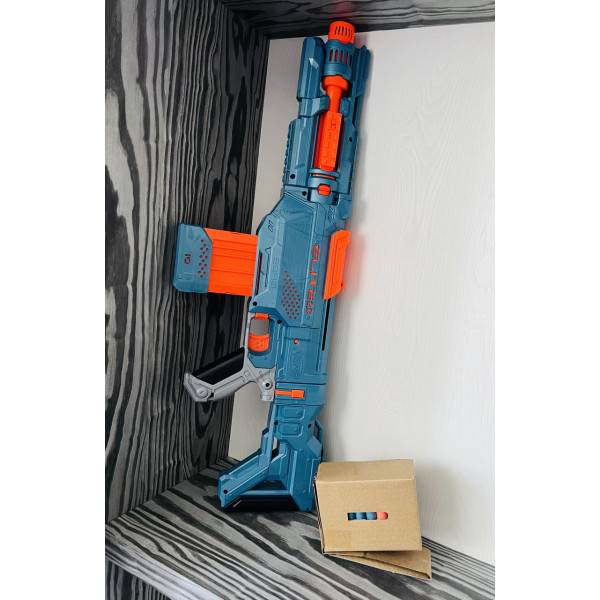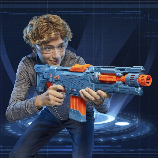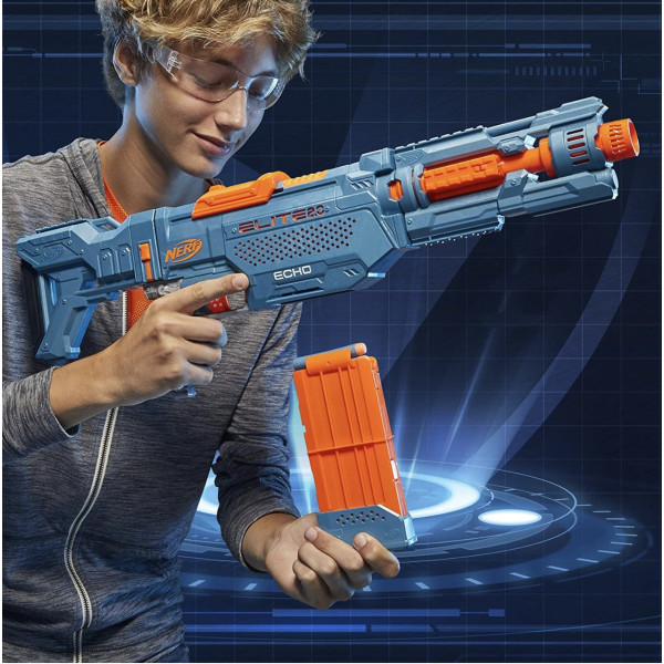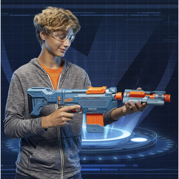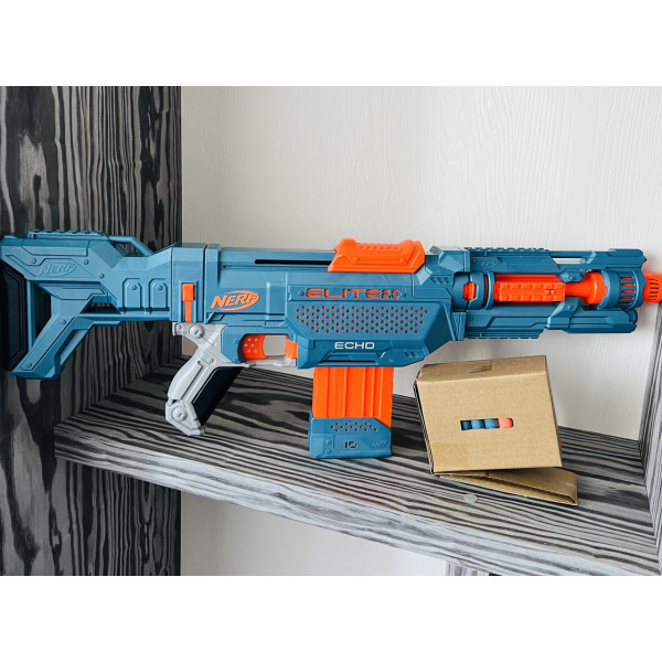 Бластер іграшковий Nerf Elite 2.0 Echo CS10 — оновлена модель універсального механічного автомата зі з'ємним прикладом, додатковим подовжувачем ствола і магазином на 10 патронів. Підтримує 4 варіанти складання. Таким чином, гравець може самостійно зібрати бластер, що відповідає будь-якій бойовій місії. Скорострільність безпосередньо залежить від спритності пересування затвору.