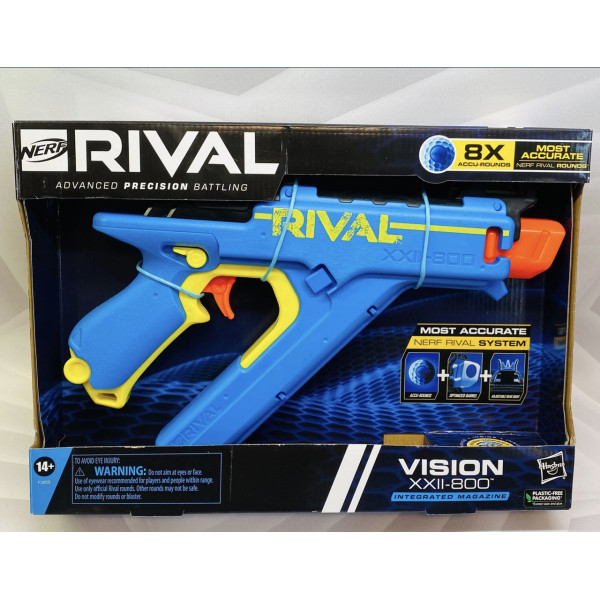 NERF RIVAL VISION XXII-800 BLASTER: із вбудованим магазином на 8 патронів, пусковою планкою, що відкидається, і замком спускового гачка.