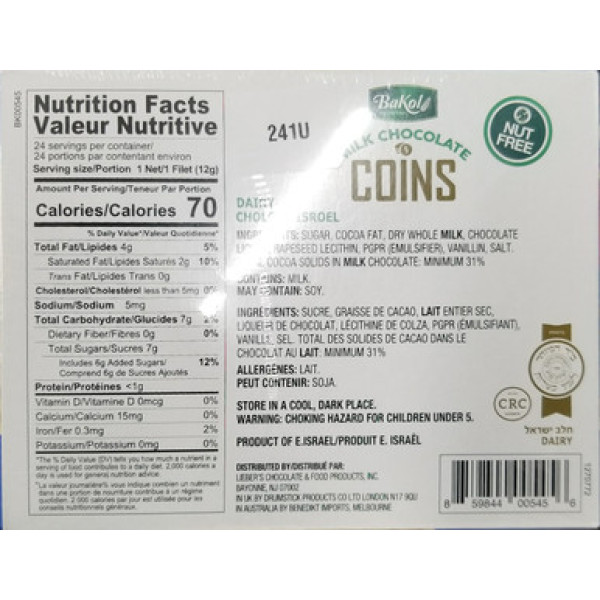 Bakol Hanukkah Milk Chocolate Gelt Coins, Nut Free, Bulk Chanukah Coin, 24 Count