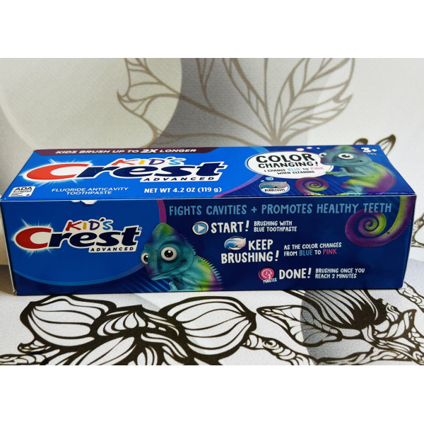Антикарієсна дитяча зубна паста Крест Хамелеон змінює колір з блакитного у рожевий після 2-х хвилин чистки зубів, чим допомагає дітям чистити зуби довше.