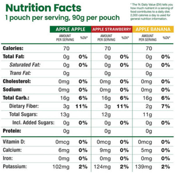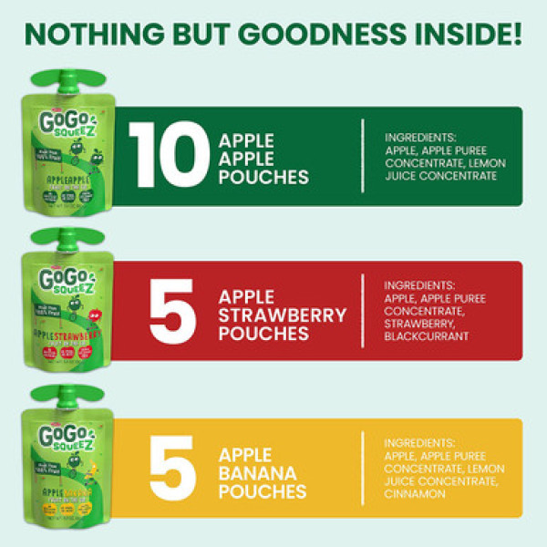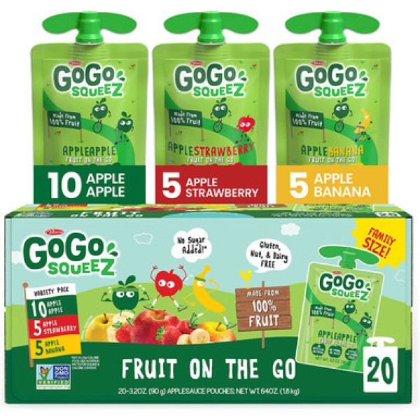 Набор пакетиков GoGo squeeZ Fruit on the Go Variety Pack – это лакомство, которое можно поесть в любое время и в любом месте. В этом наборе представлены разные вкусы: Apple Apple – это наш основной вариант яблочного пюре; Apple Banana – это идеальное сочетание яблок и бананов; Apple Strawberry – это яблоки, клубника и незабываемый вкус. Эти нежные яблочные и фруктовые закуски изготовлены на 100% из фруктов без сиропа с высоким содержанием фруктозы (HFSC), без добавления красителей или ароматизаторов и без добавленного сахара.* Все эти вкусные фрукты упакованы в удобные и бесхлопотные пакетики с яблочным пюре! Eсли речь идет о GoGo squeeZ, то наши продукты – это не только пакетики с яблочным пюре! Мы создаем наши продукты из высококачественных ингредиентов, чтобы можно было насладиться их полезностью где угодно. Наше яблочное пюре без сахара проходит сертификацию Non-GMO Project Verified, оно не содержит глютена, орехов, молочных продуктов и сертифицировано как кашрутическое. Наши продукты не содержат аллергенов, поэтому вы, ваши дети и вся семья можете наслаждаться закусками от GoGo squeeZ с уверенностью и делиться ими без опасений. GoGo squeeZ свою сладость получает от фруктов внутри. Наши пакетики безопасны для здоровья и оснащены удобной крышкой и встроенной соломкой. Нет необходимости использовать ложку, и нет беспорядка! *Низкокалорийная пища. См. информацию по питательной ценности для содержания сахара и калорий."