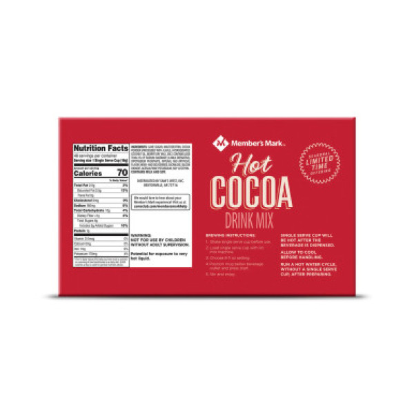Кроме того, Member's Mark Hot Cocoa – идеальное решение для тех, кто всегда в движении. Благодаря совместимости с большинством кофемашин (включая Keurig), вы можете наслаждаться этим восхитительным напитком даже в пути. Лучше всего его подавать горячим, но он также отлично подходит и для холодных напитков. Для придания особого шарма, полейте сверху вашими любимыми пенными добавками, сиропами и посыпками.