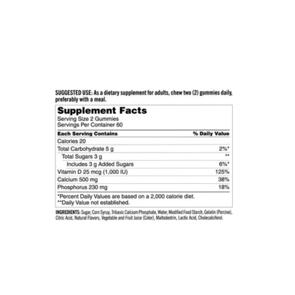 Kirkland Signature™ Calcium Adult Gummies - это вкусный способ получить кальций и витамин D, необходимые для поддержания здоровых костей. Эти два питательных вещества сотрудничают вместе, чтобы поддерживать крепкие кости и зубы, к тому же витамин D помогает поддерживать здоровую иммунную систему. Всего 2 жевательных конфеты, и вы получите 500 мг кальция и 20 мкг (1000 МЕ) витамина D.