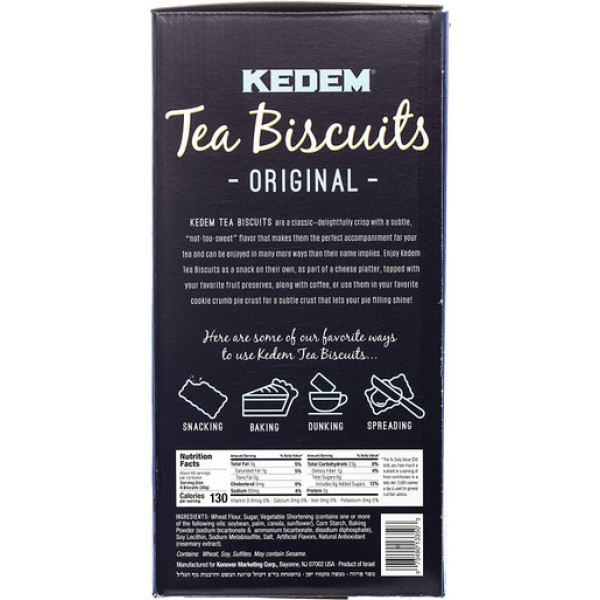 Kedem Tea Biscuits Original, 12 Pack - оригинальные чайные печеньки Kedem. Наслаждайтесь классическими чайными печеньками Kedem вместе с утренним кофе или вечерним чаем. Их идеальная консистенция делает их легко хрустящими с нежным и не слишком сладким вкусом, что делает их идеальным выбором для любителей печенья. Кроме того, они очень универсальны - вы можете перекусывать их, макать в чай, использовать при выпечке или намазывать на них различные начинки. Упаковка содержит 12 пакетиков по 4,2 унции, достаточно, чтобы запастись на долгое время и поделиться с всей семьей. Они сертифицированы и имеют кашрутную метку, что делает их подходящими для употребления в течение всего года. Если вы попробуете их, вы не пожалеете!