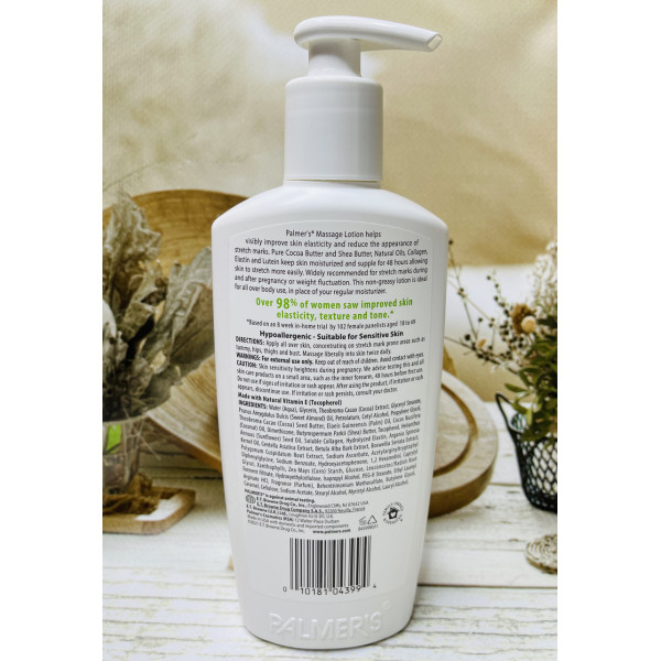 Palmers допомагає скоротити поява розтяжок завдяки особливій суміші чистого масла какао, вітаміну Е, олії ши і Bio C-Elaste. Bio C-Elaste – це потужне поєднання колагену, еластину, центелли азіатської, мигдальної олії і арганової олії.