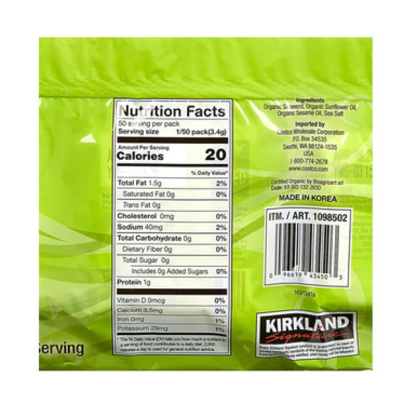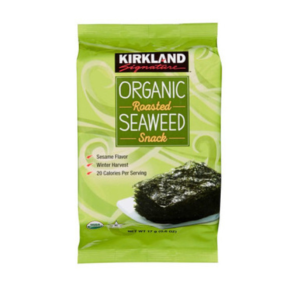 Kirkland Organic Roasted Seaweed Snack сделан из органических водорослей зимнего урожая и имеет вкус кунжута.