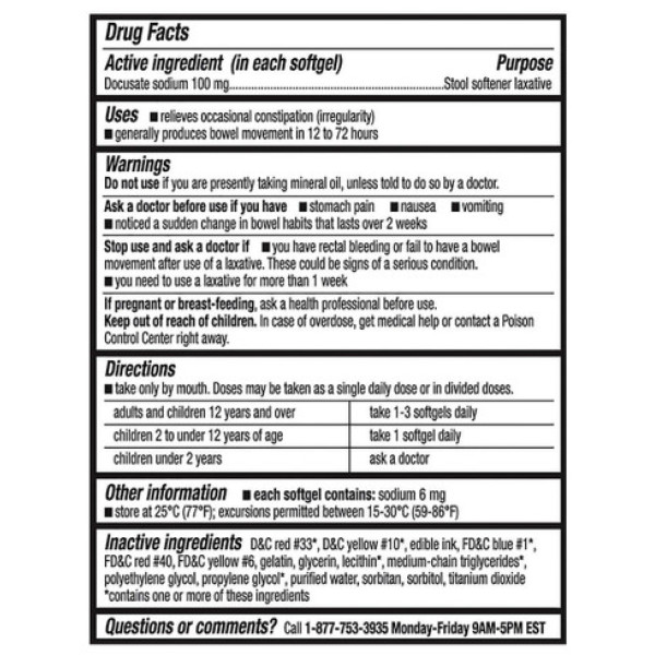 Основным действующим веществом в Kirkland Signature Stool Softener является Докузат натрия 100 мг. Он действует как безстимулирующий мягкитель стула (слабительное), чтобы нежно облегчить временное запор, обычно вызывая акт дефекации через 12-72 часа. Капсулы Kirkland Signature Stool Softener 100 мг сравнимы с активным ингредиентом в Colace® Stool Softener.