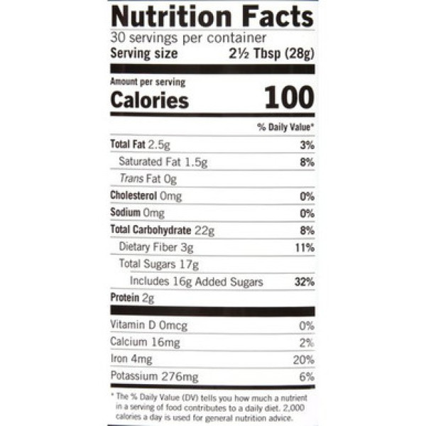 В каждой порции (2 1/2 столовые ложки или 28 гр.) содержится 120 калорий, что составляет 6% от рекомендуемой суточной нормы. Из них 20 калорий приходится на жиры, преимущественно ненасыщенные. Ваш организм также получает 22 гр. углеводов, в том числе 3 гр. клетчатки, которая является важным компонентом здорового питания.