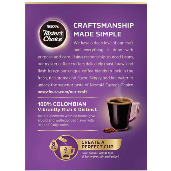Nescafe Taster's Choice Instant Coffee Colombian - это непревзойденный выбор для истинных ценителей кофе. Выполненный с полным почтением к колумбийской кофейной традиции, он представляет собой великолепное сочетание 100% арабики из Колумбии. Благодаря мастерству опытных кофейных мастеров, эти премиальные зерна обжариваются и варятся по особым правилам, чтобы запечатлеть в них ароматные и насыщенные вкусы. Быстрое замораживание порции кофе позволяет сохранить его свежесть и изысканный аромат. Разнообразные оттенки и шелковистость каждой чашки кофе станут незабываемым кулинарным путешествием для ваших чувств. Nescafe Taster's Choice Instant Coffee Colombian - это простой способ насладиться благоуханием и вкусом идеально приготовленного кофе. Моментальное наслаждение, руководство для самых изысканных гурманов!