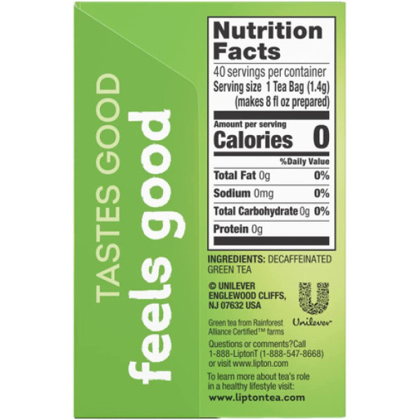 Lipton Decaffeinated Green Tea Bags, 40 Count - это прекрасное предложение для любителей зеленого чая с уникальным вкусом и свежестью. Наш зеленый чай обладает особой легкостью и необыкновенно свежим и нежным вкусом, который просто прекрасен. Мы бережно смешиваем молодые чайные листья, чтобы выразить все лучшее, что может предложить этот чудесный напиток. Вся наша продукция изготавливается из 100% сертифицированных чайных листьев, поставляемых из тропических лесов, сертифицированных Rainforest Alliance™. Каждая чашка нашего чая сопровождается освежающим легким вкусом и восхитительным мягким послевкусием. Он вкусен как горячим, так и охлажденным льдом. Добавьте в свою жизнь позитив и наслаждайтесь энергией Lipton Decaffeinated Green Tea. Этот чай будет напоминать вам о том, что действительно важно. Томас Липтон посвятил свою жизнь путешествию по миру, чтобы поделиться своей страстью к чаю. Он считал, что каждый человек заслуживает высококачественного и невероятно вкусного чая. И уже более 120 лет эта убежденность продолжает вдохновлять нас, вдохновлять на создание новых вкусов, новых сортов и все больше любви. Весь наш чай производится из 100% устойчивых источников, что означает справедливую оплату труда чайных фермеров по всему миру, а также доступ к качественному жилью, образованию и медицинскому уходу. Ваша чашка чая - это их светлое будущее.
