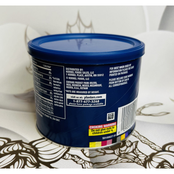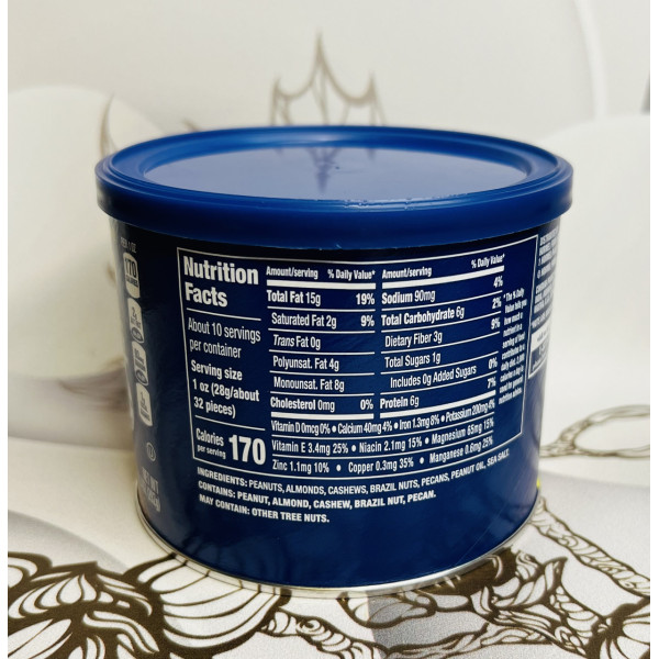 Planters Assorted Nuts – микс хрустящих орешков, упакованный в металлическую круглую баночку с крышкой из нейлона.