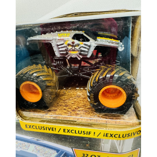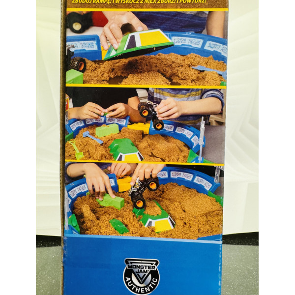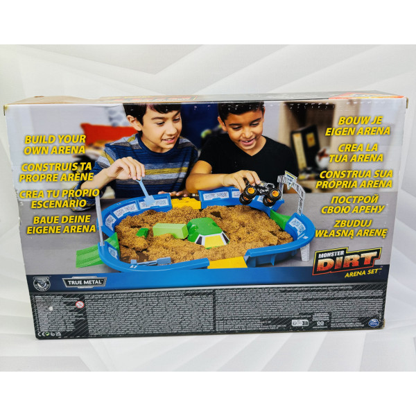 Включає: 900грам іграшкового бруду Monster Dirt, 1 арена Monster Jam, 4 рампи для входу, 1 табло, 1 велика форма для рампи, 1 форма для розчавленого автомобіля, 1 форма для транспортного контейнера, 2 інструменти для ліплення, 1 аркуш наклейок, 1 офіційна вантажівка Monster Jam.
