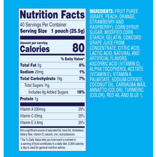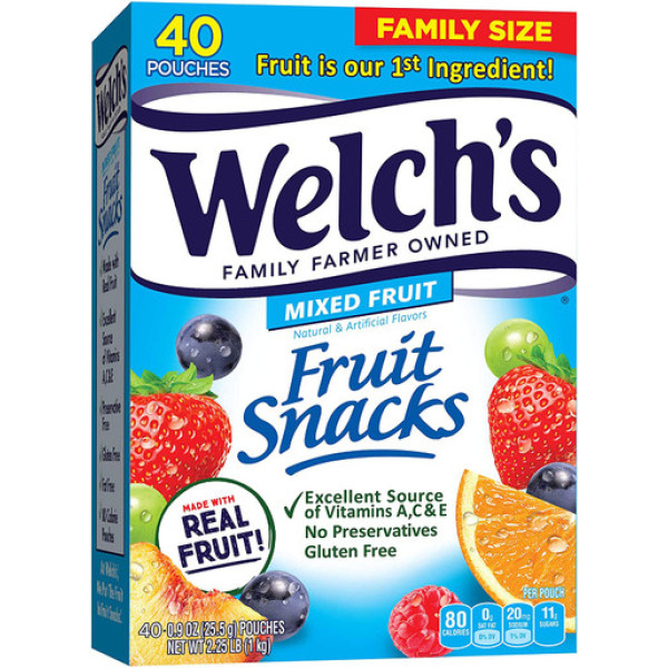 Вкусные фруктовые закуски, где фрукты являются первым ингредиентом. 100% витамина C, 25% витаминов A и E (DV на порцию). Без глютена, без жира и без консервантов. Идеальная вкусная закуска для школьных обедов, спортивных игр, офиса и не только. Welch's Fruit Snacks Mixed Fruit. Принадлежат семейным фермерам. Порции по 80 калорий. Фрукты - наше главное ингредиент. Естественные и искусственные ароматизаторы. Созданы на основе настоящих фруктов. DV на порцию: 100% витамин C, 25% витаминов A и E. Без жира. Без глютена. Без консервантов.