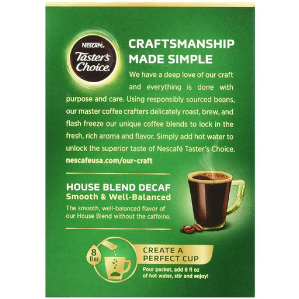 NESCAFÉ TASTER'S CHOICE Decaf House Blend Medium Light Roast - это ароматный напиток с гладким и приглашающим вкусом, который пригоден для тех, кто предпочитает кофе без кофеина. Используя только 100% натуральный кофе, мы обеспечиваем высокое качество каждой чашки. Наша смесь состоит из лучших зерен арабики и робусты, полученных из ответственных источников, и мы тщательно обжариваем их, чтобы сохранить полный вкус и аромат каждого бленда. NESCAFÉ TASTER'S CHOICE подарит вам возможность насладиться свежеобжаренным кофе мгновенно, без лишних усилий.