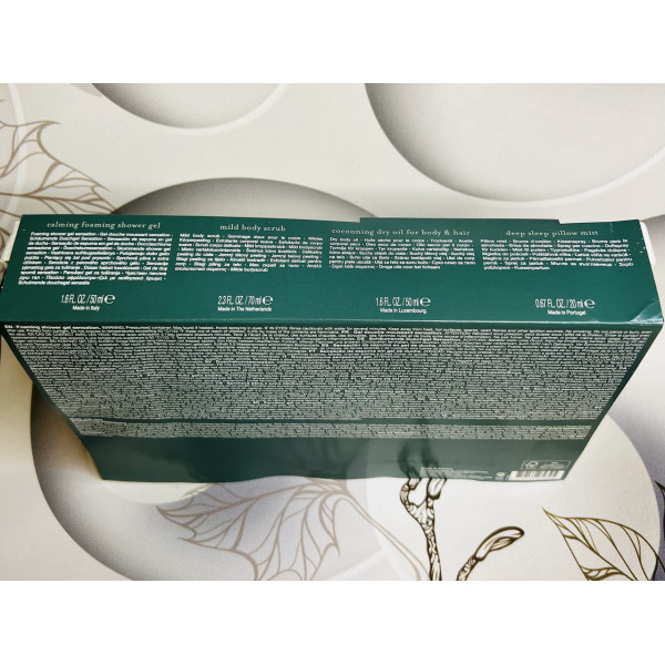 Гель для душу 50мл, скраб для тіла 70мл, масло для тіла та волосся 50мл, спрей для подушки 20мл.