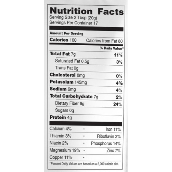Диетическая ценность продукта весьма высока – в одной порции (2 столовые ложки или 20 г) содержится 100 калорий, в том числе 80 калорий от жиров. Общий жирность в продукте составляет 7 г, насыщенных жиров – 0,5 г, трансжиров – 0 г.