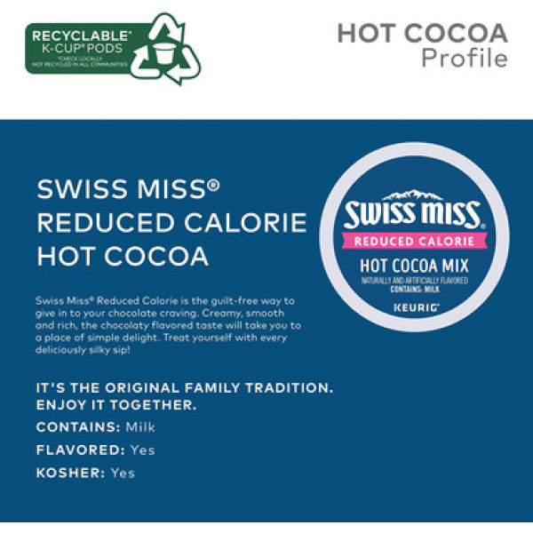 - Прекрасный вкус горячего швейцарского какао Swiss Miss с меньшим количеством калорий и сахара.