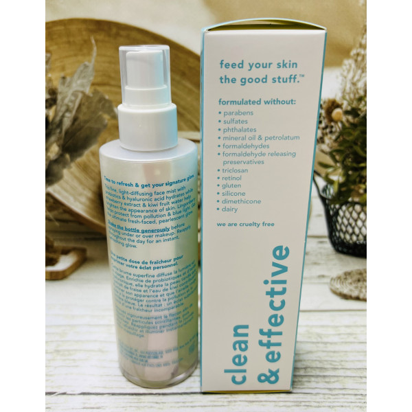 Формула не містить олії та спирту, доповнена пробіотичними екстрактами, полуницею та фруктовою водою з ківі, щоб допомогти збалансувати шкіру та забезпечити неймовірне перламутрове сяйво. Тонке та розсіююче світло, цей спрей для обличчя має тонкий, освіжаючий аромат, який миттєво покращує настрій.