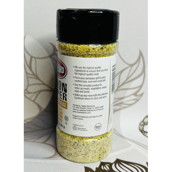 "Kingsford Badia Lemon Pepper All-Purpose Seasoning" is a versatile blend of herbs and spices that will add incredible flavor to all your meats, vegetables, soups, eggs, and pasta. This delicious Caribbean blend of citrus and spices will add a unique twist to any dish.