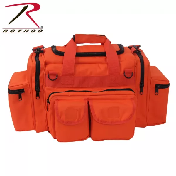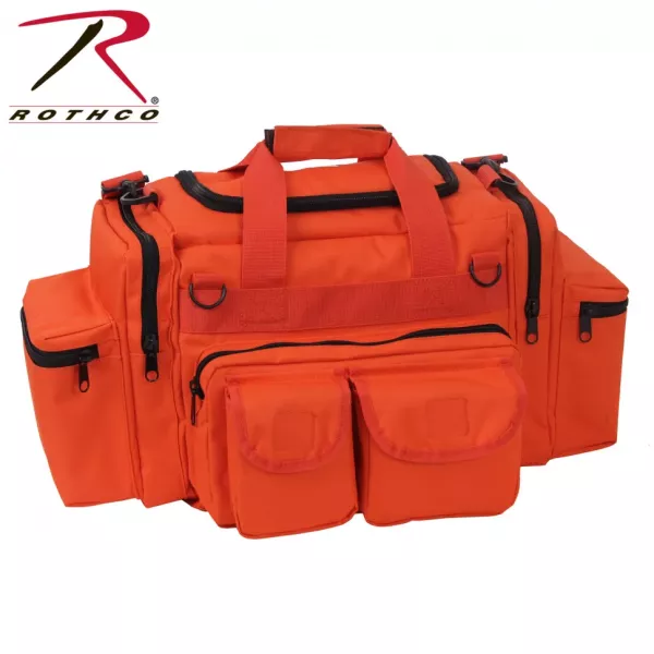 Оранжевый и вместительный медицинский баул. Основной отсек закрывается двусторонней молнией. Внутри основного отделения есть съемные подкладки для удобного хранения и переноски инструментов, медикаментов, бинтов, лекарств и других предметов. На наружной стороне есть 5 карманов на молниях и 2 кармана с клапанами на липучках велкро. Сумку удобно переносить с помощью ручек или съемного регулируемого плечевого ремня с нескользящей накладкой. Внутри сумки есть 6 рядов строп PALS для крепления дополнительного снаряжения системы MOLLE. Верхняя часть сумки украшена белым медицинским крестом. Размеры составляют 55,8 x 28 x 29,2 см. Материал сумки - 600 дениеровый полиэстер с ПВХ. Цвет - оранжевый. Артикул: 613902026995. Производитель: ROTHCO Morris Rothenberg & Son, Inc. (NY, USA). Произведено в Китае.