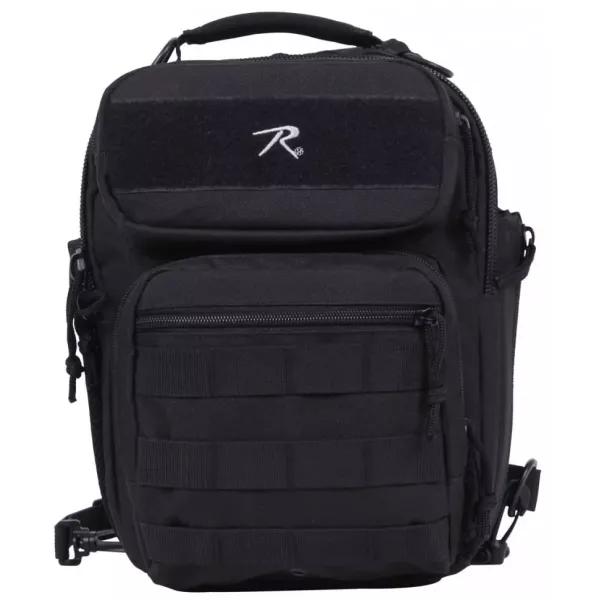 Компактный плечевой рюкзак Rothco в черном цвете 25510 - вот так можно описать эту тактическую сумку. В ее конструкции есть регулируемый широкий ремень (шириной 7 см) с мягкой подкладкой и фастекс-пряжкой. Боковой подсумок с вместительностью позволяет удобно хранить бутылку с водой. Задний карман скрытого ношения оружия закрывается на кнопку. Три внешних кармана оснащены молниями. Присутствует также липучка на велкро для крепления к ремню брюк. На сумке имеется ворсистая липучка на велкро для закрепления нашивок и опознавательных знаков. Для крепления аксессуаров и подсумков MOLLE предусмотрены стропы PALS. Сумку легко переносить с помощью ручки. Ее размеры составляют 23 х 9 х 30 см. Материал, из которого сумка изготовлена - полиэстер с ПВХ покрытием с плотностью 600 Денье. Черный цвет делает сумку стильной и универсальной для разных ситуаций. Штрих-код данного товара: 613902250154. Производитель сумки - ROTHCO (Нью-Йорк, США), а изготовлен она в Китае.