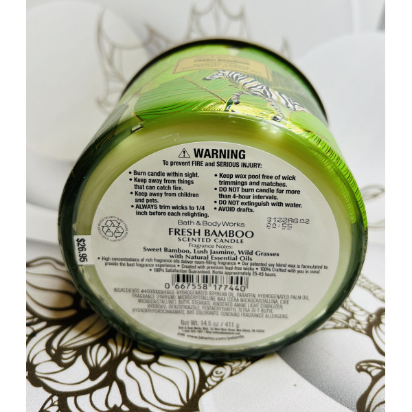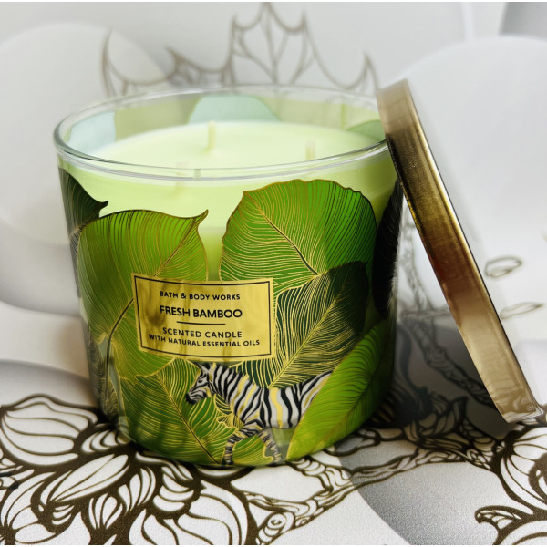 Солодкий бамбук, жасмин, дика трава - такі неперевершені аромати мають свічки Bath and Body Works з трьома ґнотами. Ці свічки згорять протягом 72 годин безупинного полум’я. Виробник радить не залишати свічку горіти більше 4 годин поспіль. Горіння свічки буде рівним, без копотінь.