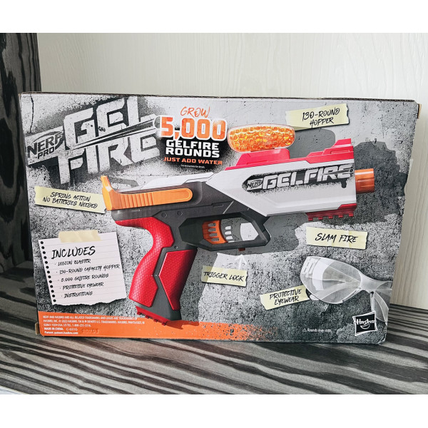 У наборі з бластером ви купуєте: бункер на 130 боєприпасів, захисні окуляри та 5000 м’яких дегідратованих снарядів Nerf Pro Gelfire.