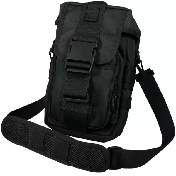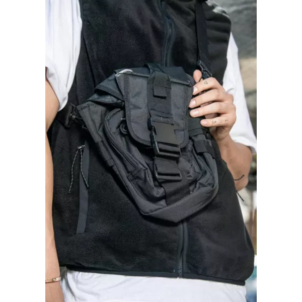 Чорна тактична плечова сумка "Флексипак". Регульований плечовий ремінь (з підпоролоненою накладкою) з кріпленням до D-кілець сумки за допомогою пластикових карабінів. Клапан на ремені з широкою пряжкою фастекс. Головне відділення з внутрішнім мішком з затягуючим шнуром і двома внутрішніми кишенями. Зовнішнє відділення на блискавці з плоскою кишенею на зовнішній стороні. Ручка для носіння в верхній частині сумки. Пов'язки PALS для кріплення аксесуарів і кишень MOLLE або ALICE. Розміри: 30 x 10 x 15 см. Матеріал: 600 День поліестер з ПВХ. Колір: чорний. UPC: 613902832008. Виробник: ROTHCO Morris Rothenberg & Son, Inc. (NY, USA). Вироблено в Китаї для США.