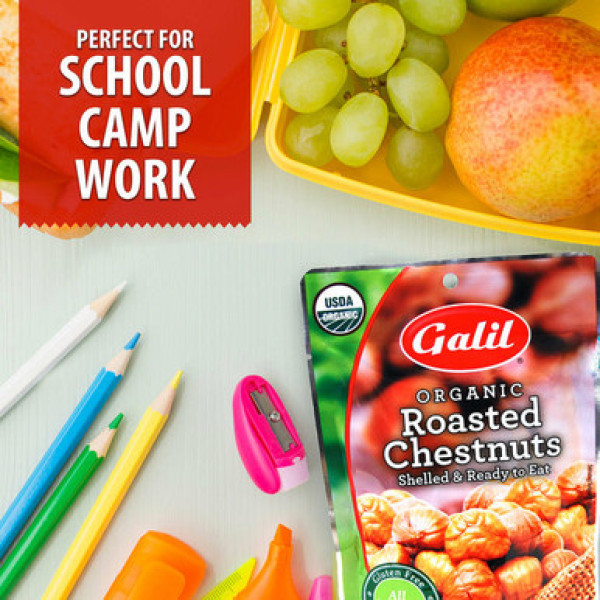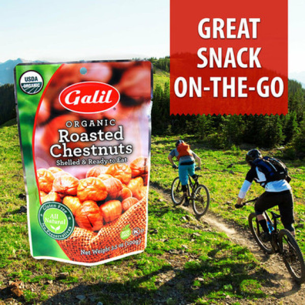Galil Organic Roasted Passover Chestnuts - чудова натуральна закуска для Песаха і у будь-який час року. 100% органічно вирощені горішки каштанів мануально відібрані і обсмажені на вогні для виняткової якості та смаку. Обсмажені каштани Galil ідеально підходять для приготування і випікання у всіх улюблених рецептах: супи, начинки, печиво і торти. Що найголовніше, вони є джерелом поживних речовин, включаючи вітамін С та клітковину!