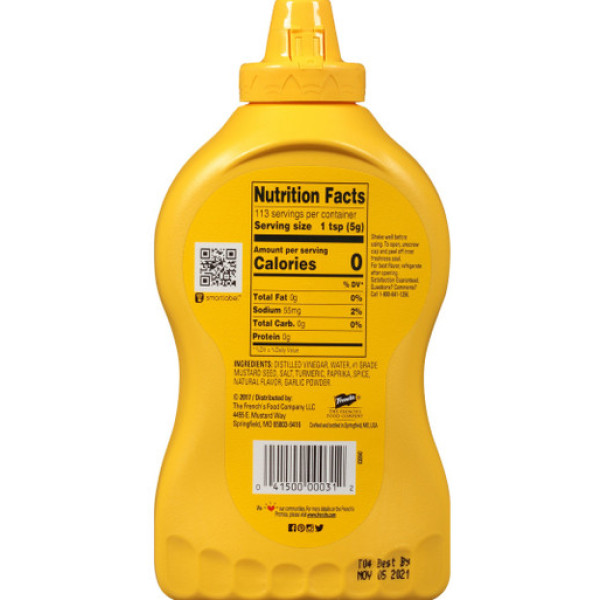Французька Класична Жовта Гірчиця - улюблена гірчиця Америки. Вона завжди була виготовлена з натуральних та простих інгредієнтів, які й сьогодні вважаються «чистими». Більше століття по тому, і ці інгредієнти все ще залишаються чистими. Наша обіцянка означає, що всі наші продукти відповідають тій самій високій якості. У Французькій ми дуже стараємося створювати продукти, які б вас пишали подавати своїй родині та друзям. Це означає відсутність штучних ароматизаторів, барвників, фарб або кукурудзяного сиропу з високим вмістом фруктози. Французька Класична Жовта Гірчиця виготовляється зі столового, першого сорту насіння гірчиці та не містить штучних кольорів, смаків або консервантів. Ми не робимо жодних прибирань, жодних дивних речей, лише яскраве жовте, яке оживляє їжу з нульовим вмістом жиру, калорій та глютену. Протягом понад 100 років Французька Класична Жовта Гірчиця дарує м'яку текстуру та терпкий смак своїм родинам по всій Америці.