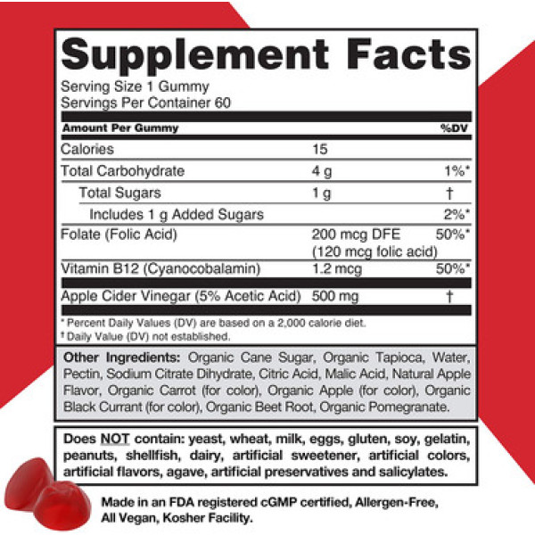 Голі яблучний оцет гумові вітаміни, без глютену, веганські, вітаміни В9, В12, буряк, гранат, 60 штук