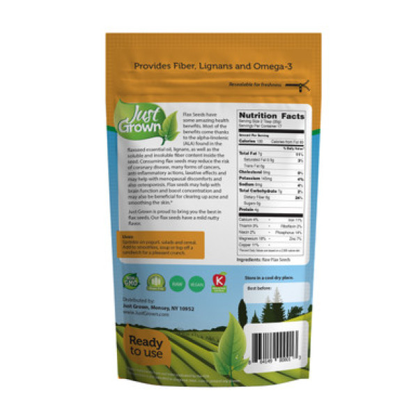 Just Grown Raw Black Flax Seeds переповнує корисними речовинами, такими як 6 грамів волокон, 4 грами білків, 4 грами Омега-3 на порцію.