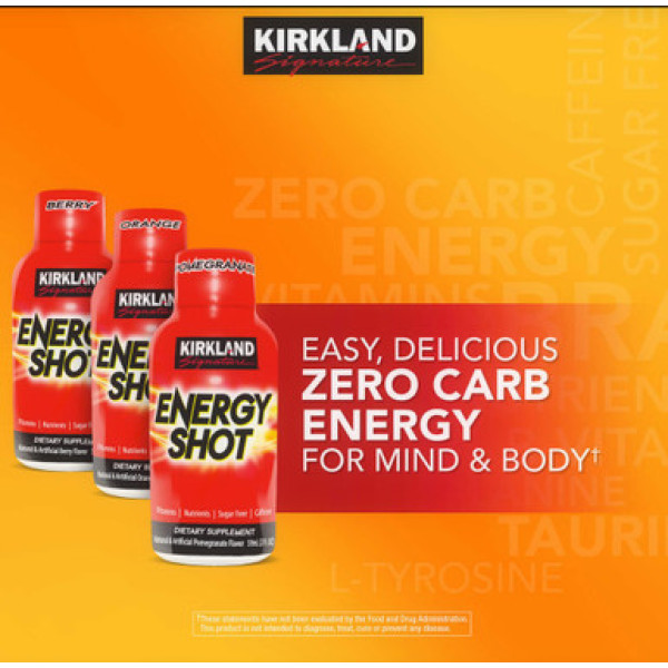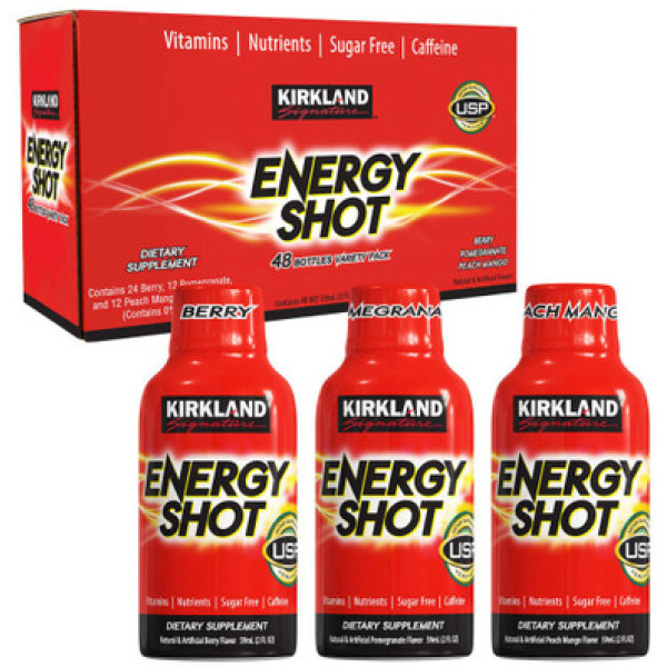 Kirkland Signature™ Energy Shot зручний і смачний, упакований у 48 пляшечок (2 фл. унції кожна) в коробці з різноманітним набором з 3 смаків: 24 пляшечки з ягоди, 12 пляшечок з вишнево-манговим смаком та 12 пляшечок з гранатовим смаком. Ви можете взяти один з цих розчинів для отримання додаткової порції енергії або концентрації перед тренуванням або фізичною активністю, коли ви прокидаєтесь, щоб розпочати день, коли вам потрібен заряд енергії на роботі, особливо після обіду, або коли ви подорожуєте та вас починає долати перепад часових поясів.