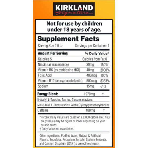 Kirkland Signature™ Energy Shot забезпечує миттєву енергію для розуму і тіла. Він розроблений з системою поживних речовин та вітамінів групи В, які доведено, що збільшують здатність організму виробляти енергію, як ментальну, так і фізичну. Цей рідкий напій містить закритий комплекс енергії, розроблений для підвищення рівня енергії. Він також надає здорове джерело багатьох вітамінів групи В - В3, В6, В12 та фолієвої кислоти, корисні амінокислоти, включаючи L-тирозин, L-фенілаланін та таурин, а також поживні речовини для стимуляції мозку, такі як глюкуронолактон та альфа-гліцерилфосфорилхолін, які покращують увагу та концентрацію.