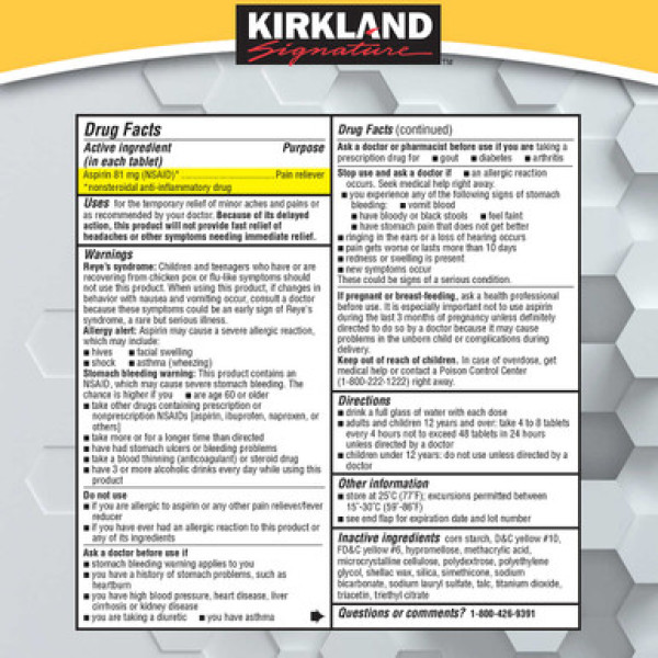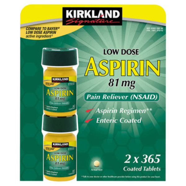Kirkland Signature Aspirin Low Dose 81 mg., 365 Enteric Coated Tablets - найкращий варіант для полегшення болю та запобігання запаленням. Активний компонент Kirkland Signature Low Dose 81mg Aspirin – ацетилсаліцилова кислота 81 мг. Ця доза рекомендована для дорослих та дітей від 12 років як ефективний вибір надлегкого знеболювального засобу. Kirkland Signature 81mg Aspirin має дар лагідно впливати на шлунок та є безпечним для встановлення індивідуальної аспіринової схеми за дорученням лікаря.