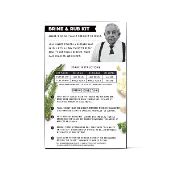 Застосування Kinder's Organic Butcher's Brine Kit допоможе створити незабутній смак святкової індички. Комплект включає у себе майстер-солевий розчин, ніжний Індичий Приправа з маслом, міцний пакет для посолу та спеціальний вижимка. Цей набір є найкращим поєднанням для досягнення найсмачнішої птиці. Майстер-росчин створений з дуже гармонійного поєднання солі, спецій та цукру, а наша перевірена Індичий Приправа з маслом поєднує в собі масло та спеції для класичного смаку, який забезпечить радість усій вашій родині. Цей набір містить все необхідне для посолу індички вагою до 20 фунтів.