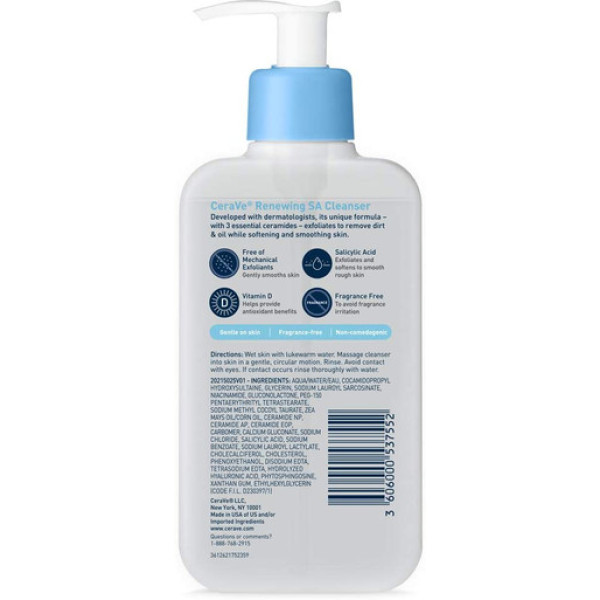 CeraVe Renewing SA Cleanser - це засіб для очищення шкіри, розроблений разом з дерматологами. Він допомагає ефективно і дбайливо очистити шкіру від бруду та шкірного жиру, одночасно забезпечуючи збереження м’якості і гладкості. Головна перевага цього засобу полягає в його ексфоліюючій дії, яка відбувається за рахунок присутності саліцилової кислоти, гіалуронової кислоти, ніацинаміду та антиоксиданта вітаміну D. Вони відлущують відмерлі шкірні клітини, забезпечуючи підтримку гідратації і очищення. Крім того, засіб містить три важливі цераміди (1, 3, 6 II), які допомагають відновити і підтримувати природний захисний бар'єр шкіри.
