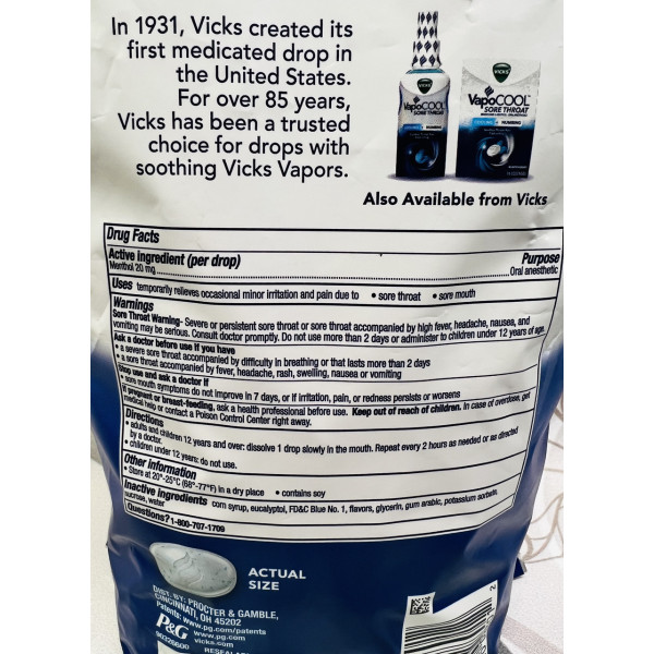 Льодяники проти кашлю та болю в горлі Vicks VapoCool Medicated Drops оригінал