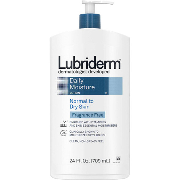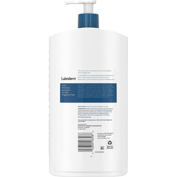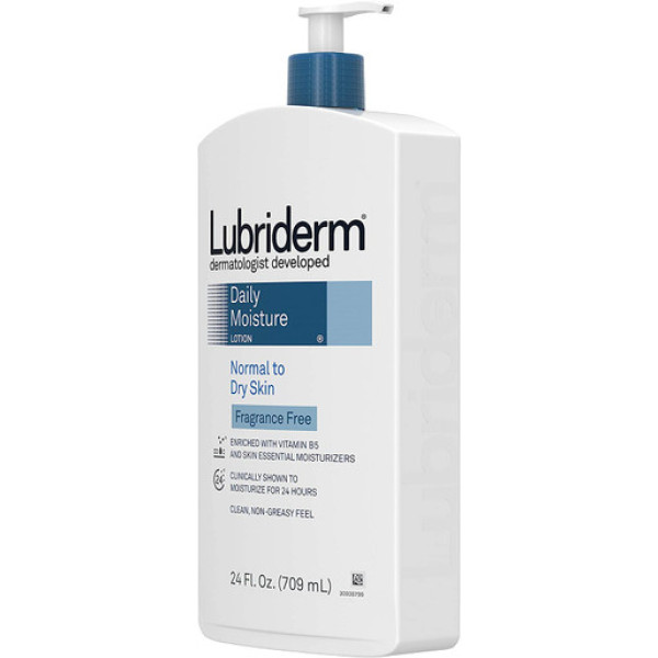 24-флакон з беззапаховим зволожувальним лосьйоном для тіла Lubriderm Daily Moisture Hydrating Unscented Body Lotion, 24 oz з вітаміном B5, який допомагає збагатити і зволожити звичайну і суху шкіру. Швидковбираюча формула цього лосьйону допомагає зберегти татуювану шкіру найкращим чином. Крім того, цей лосьйон, розроблений дерматологами, є №1 рекомендованою маркою татуювальними майстрами для догляду за татуюванням та догляду після процедури. Беззапахова й негрязна формула залишає приємний, м'який, чистий і гладкий відчуття на шкірі. Для зовнішнього використання, рівномірно нанесіть цей зволожувальний лосьйон на звичайну та суху шкіру рук і тіла для щоденного зволоження і зволоження. Ідеально підходить для звичайного і сухого типу шкіри, Lubriderm Daily Moisture Fragrance-Free Body Lotion поповнює запаси і допомагає зволожити суху шкіру. Від марки, розробленої дерматологами, цей щоденний зволожувальний лосьйон діє клінічно доведено 24 години. Він створений з вітаміном B5 і незамінними зволожувачами шкіри, щоб покращити захисний бар'єр вашої шкіри. Крім того, він має негрязну формулу, для приємного м'якого і гладкого відчуття на шкірі. Швидковбираюча формула беззапахового лосьйону допомагає тримати татуювану шкіру в найкращому стані. Крім того, Lubriderm є №1 рекомендованою маркою татуювальними майстрами для догляду за татуюванням та догляду після процедури.
