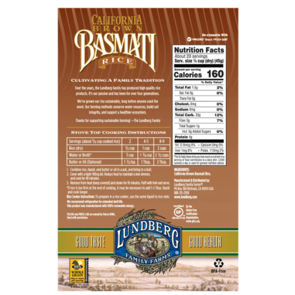 Вирощені зі зберіганням ґрунту практиками, наші понад 20 сортів рису і квіноа вирощені з максимальним наголосом на смак кожного крихітного зернистого зерна. Довгі, короткі, чорні, каштанові, білі, червоні і змішані. Кожен сорт приносить щось інше на стіл, щоб ви могли відчути себе креативними на кухні. Насолоджуйтеся поживностями цілого зерна з Лундберґом Каліфорнійською кашта басматі. Каліфорнійська кашта басматі завжди була улюбленою сімейною стравою заради своєї поживності, універсальності та приємного аромату. Це довге, тонке зерно легке і не злипається при готуванні, що робить його природним вибором для страв з каррі, салатів, плову та десертів, які вимагають окремих зерен з пухкими текстурами. Ще хочете? Шукайте інші смачні гарніри, страви, закуски та упаковані сорти рису і квіноа від Лундберґа. Від гранули до добра!