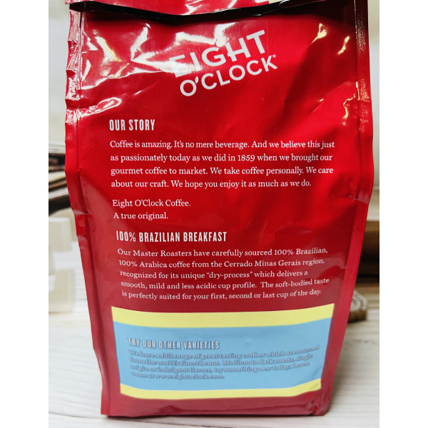 Від Латинської Америки до Східної Африки компанія Eight O’clock ретельно шукає у світі 100% арабіку преміум-класу з правильним смаком. Майстри дають каві середню обсмаженість, забезпечуючи солодкі та фруктові нотки з добре збалансованим післясмаком. Незважаючи на те, що багато хто вважає Eight O’clock ідеальним початком дня, він однаково зручний як підбадьорливий напій середини ранку, так і як ситний десертний напій.