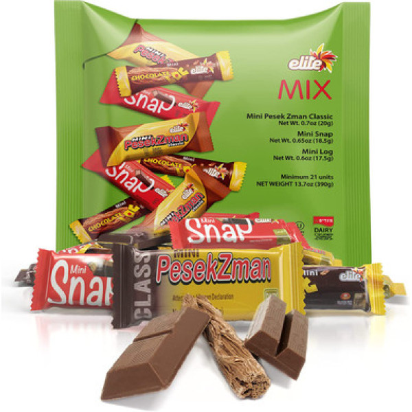 A Sweet Taste of Israel, delivered to your door! Introducing Elite Mini Milk Chocolate Bar Variety Pack, weighing 13.7 oz. This pack is a combination of Elite's famous mini chocolate bars, carefully curated to satisfy your cravings. Inside this pack, you will find Mini Pesek Zman Bar - a pure Milky Goodness that will transport you to chocolate paradise. You will also find Mini Snap, a delightful and crunchy chocolate bar that provides a satisfying snap with each bite. Additionally, the pack includes Mini Chocolate Log, a super delicious treat that pairs perfectly with your morning coffee or afternoon tea.