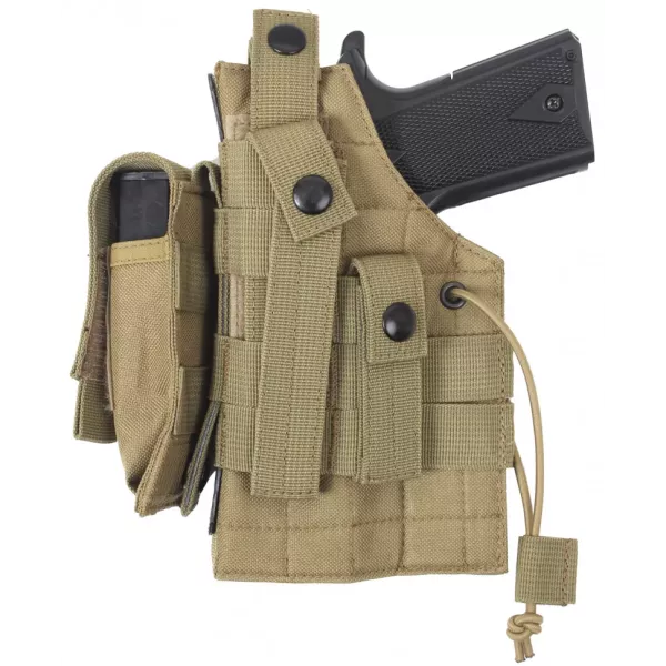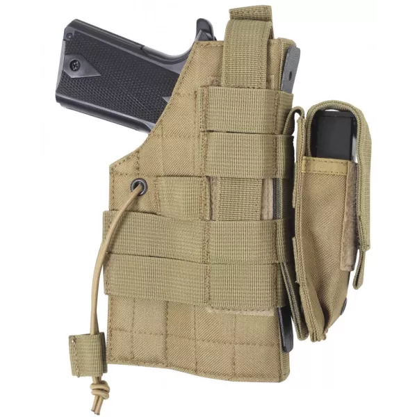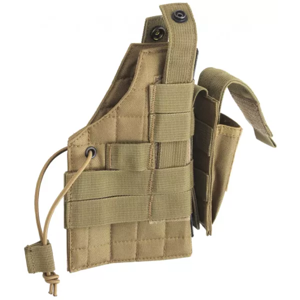 Модульна універсальна тактична кобура MOLLE для пістолетів. Модульна система дозволяє встановити кобуру на ліву або праву руку. Фіксація пістолета ременем на кнопці та еластичним шнуром. Знімний кишень MOLLE для одного додаткового магазину з клапаном на липучці Велькро. Система кріплення: MOLLE II. Матеріал: 600 поліестер з полівінілхлоридом. Колір: койот. Позиція # 10479 РOTHCO MOLLE МОДУЛЬНА КОБУРА - КОЙОТ. Виробник: ROTHCO Morris Rothenberg & Son, Inc. (Нью-Йорк, США). Вироблено в Китаї для США.
