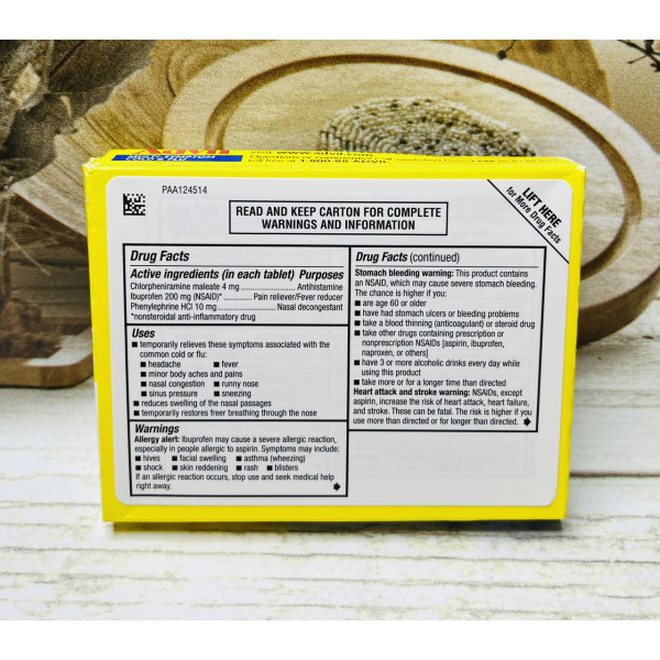 Активні компоненти: Chlorpheniramine Maleate (4mg) (Antihistamine), Ibuprofen (NSAID) - 200 mg (Pain Reliever/Fever Reducer), Phenylephrine HCl (10 mg) (Nasal Decongestant), (Nonsteroidal Anti-Inflammatory Drug).
