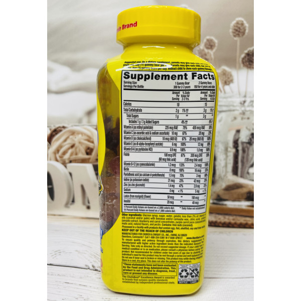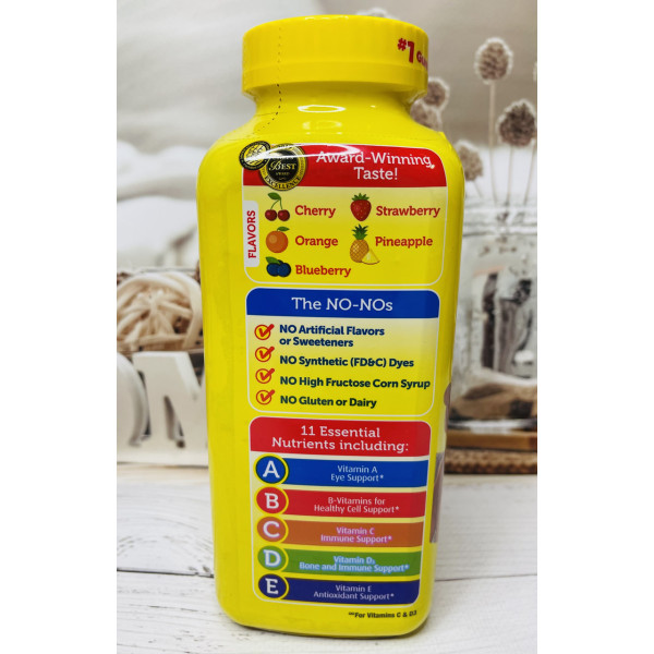 Комплекс мультивітамінів для дітей, Gummy Vites, Complete Multivitamin, Natural Fruit Flavors - це підтримка маленького організму в необхідних поживних речовинах. Вітамін С бере участь у освіті клітин, що захищають імунну систему. Бере участь в утворенні лейкоцитів, що захищають від різноманітних інфекцій, допомагає засвоїтися залізу та вітаміну Е, і є хорошим імуномодулятором. Антиоксидантна дія вітаміну посилюється каратеноїдами та флавоноїдами, сприяє засвоєнню хрому та кальцію. Виводить токсини та регулює обмін речовин. Вітаміни групи В, дуже корисні для шкіри, нігтів та волосся. Знижують дію стресів, нормалізують травну систему, стабілізують цукор у крові. Так само до складу препарату входить вітамін А, зберігає та відновлює зір, що служать для формування та зміцнення кісток. Вітамін Д необхідний для правильного формування кісток, що покращує всмоктування кальцію та фосфору з їжі. Вітамін Д необхідний для профілактики раннього рахіту, запобігає розвитку карієсу у дітей, сприяє швидкому зростанню здорового організму. Цинк потрібен для безперебійної роботи імунної системи, він перешкоджає інфекційним захворюванням та бореться з пухлинами. Відомо, що цинк важливий у синтезі білків організму та при копіюванні генетичного матеріалу, коли клітини діляться і ростуть, бере участь в утворенні інсуліну, гіпофізу та кров'яних тілець. Вітамін Е необхідний для структурної та функціональної підтримки скелетної, серцевої та гладкої мускулатури. Вітамін Е також допомагає у формуванні червоних кров'яних клітин та допомагає підтримувати запаси вітамінів А та К, заліза та селену. Йод - є основою тиреоїдних гормонів: тироксину та трііодтироніну, що відповідають за розвиток та зростання організму, за ефективність обмінних процесів, та за вироблення тепла. Недолік йоду – це основна причина захворювання щитовидної залози: кретинізм, ендемічний зоб з гіпотиреозом, зниження фертильності, вроджені вади розвитку та загальмованість у дітей, а також зниження інтелекту у дорослих.