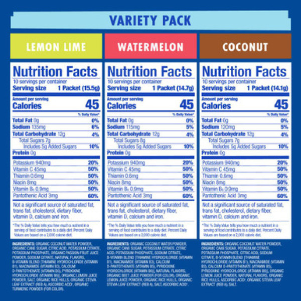 Без жиру, глютену і ГМО - і тільки з 45 калоріями в пакетику, Vita Coco Hydration Drink Mix є розумнішою альтернативою більшості газованих напоїв, спортивних напоїв та фруктових соків.