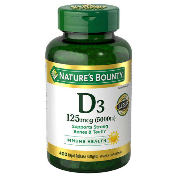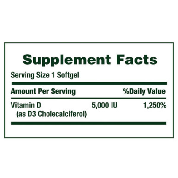Nature's Bounty D3 125 mcg 5000IU - це потужна й активна форма Вітаміну D, яка підтримує міцні кістки та зуби. Вітамін D3, також відомий як холекальциферол, є необхідним для здоров'я імунної системи та нервово-м'язового аппарату.