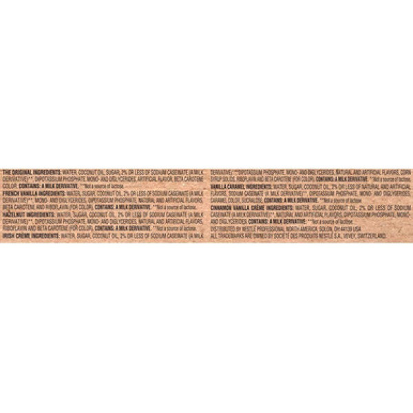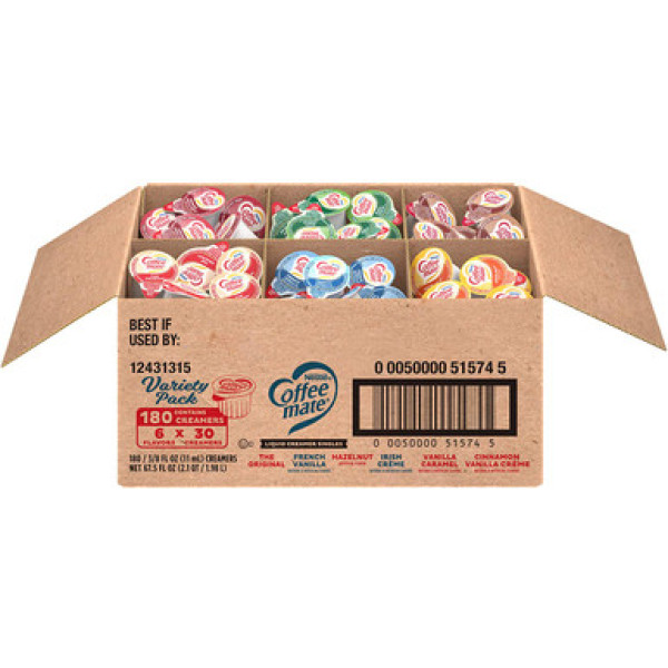 Різноманітність в одній коробці: 6 найпопулярніших смаків кавового крему Nestle Coffee mate, упакованих в зручну коробку: Оригінальний, Французький ваніль, Горіховий, Корицевий ванільний крем, Ірландський крем та Ванільно-карамельний (30 штук кожного смаку; загалом 180 кремерів).