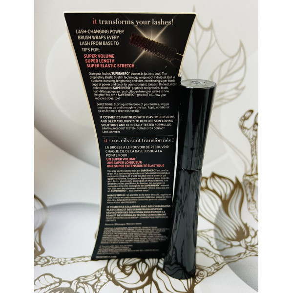 Розроблена пластичними хірургами, туш IT Cosmetics Superhero Elastic Stretch Volumizing Mascara схожа на догляд за шкірою для вій. Запатентована технологія еластичних розтяжок розтягує зовнішній вигляд ваших вій ширше і довше і обгортає кожну вію. Потужні війкові полімери, волюмізуючий колаген, що підсилюють біотин, білки та пептиди у поєднанні з супер-чорним пігментом та щіткою для завивки вій працюють разом, щоб покрити всі вії від основи до кінчиків. Надширока формула виводить ваші вії на нові висоти.